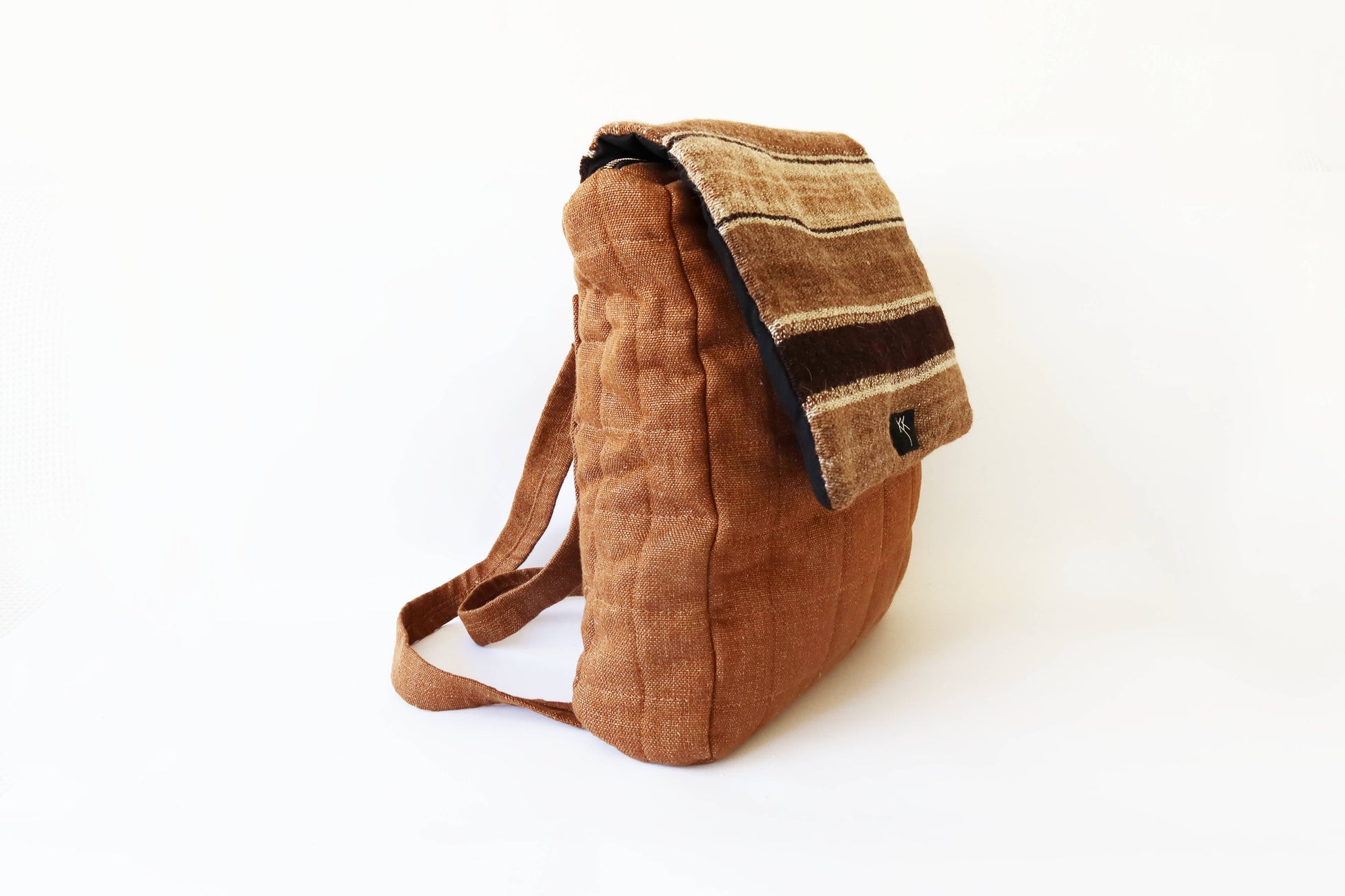 The base of the backpack is made from 100% Linen, offering a lightweight yet durable structure. -