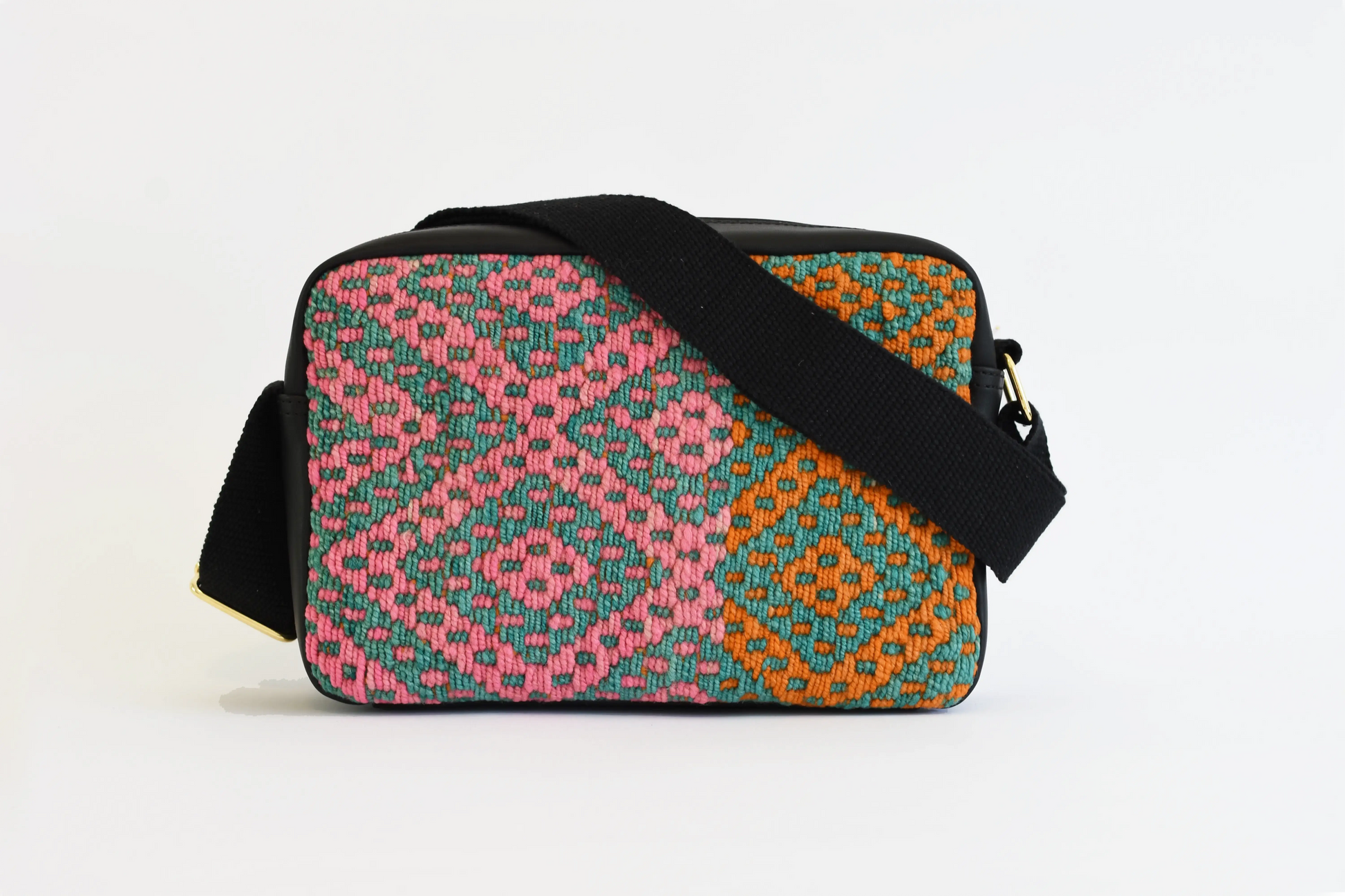Handwoven wool crossbody with naturally dyed textile, lightweight carry..